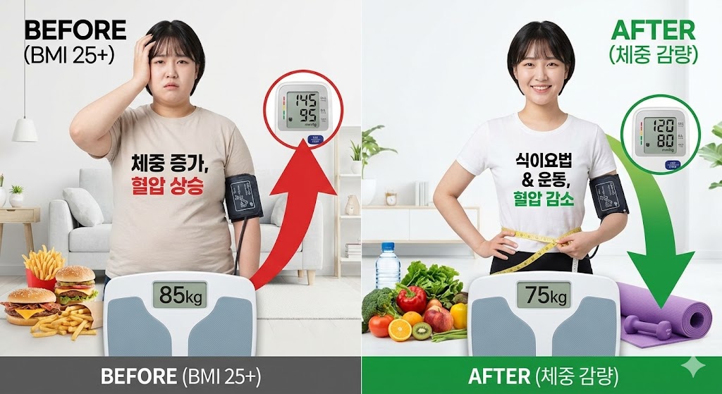 체중 1kg을 감량할 때마다 혈압이 약 1mmHg 감소한다는 연구 결과도 있습니다.