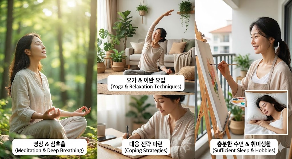 - 명상, 심호흡, 요가 등 이완 요법 활용