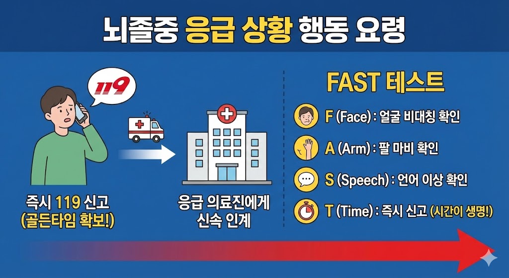 뇌졸중 전조증상이 나타나면 1분 1초가 중요합니다. 가족이나 본인이 직접 병원에 가는 것보다 119를 부르는 것이 가장 안전하고 빠릅니다. 응급차는 CT·MRI가 가능한 병원으로 즉시 이송되며, 의료진에게 상태를 신속히 전달할 수 있습니다. 또한 FAST 테스트(얼굴·팔·말·시간 확인)를 스스로 체크해 응급 상황 여부를 판단할 수 있습니다.