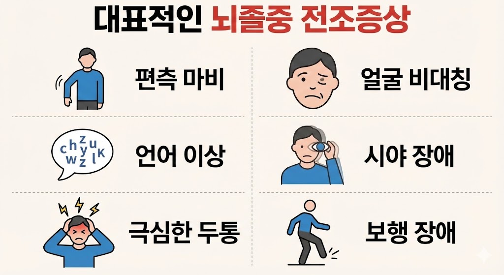 뇌졸중 전조증상은 단순한 어지럼증이나 피로감으로 오해하기 쉬워 조기 발견이 어려운 경우가 많습니다. 그러나 이 신호를 놓치게 되면 몇 시간 안에 뇌 손상이 빠르게 진행될 수 있어 생명은 물론, 말하기·걷기·기억력 등 일상 기능에 심각한 영향을 줄 수 있습니다.