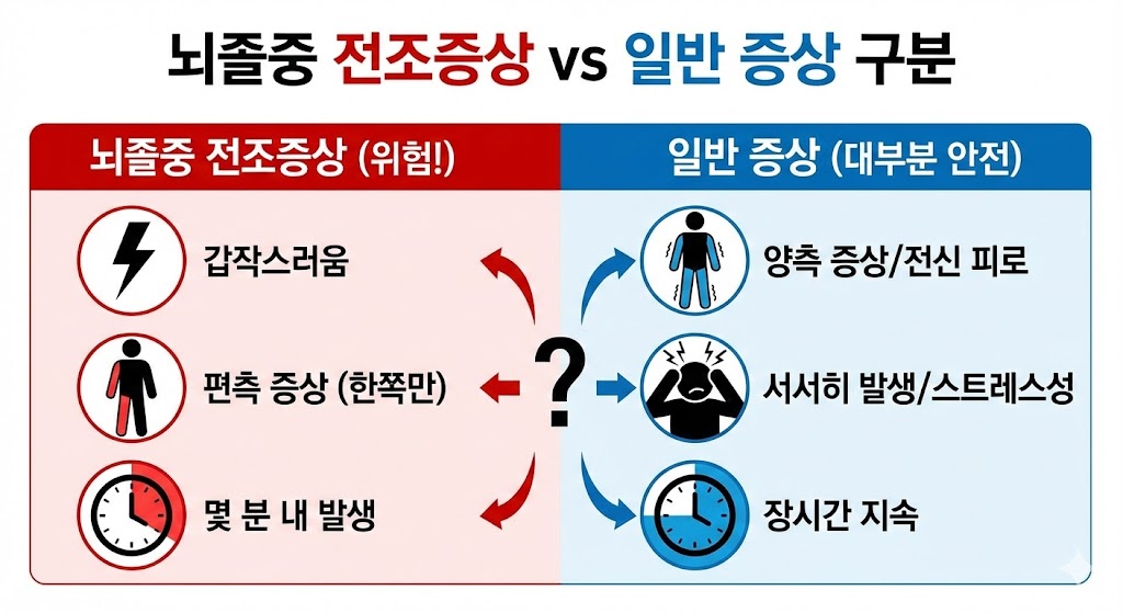 어지럼증이나 두통은 일상에서도 자주 나타나지만, 뇌졸중 전조증상과 일반 증상을 구분하는 핵심은 ‘갑작스러움’과 ‘편측 증상’입니다. 양쪽 팔·다리가 모두 저리거나 피로로 인한 두통은 대부분 뇌졸중과 관련이 없지만, 단 한쪽에만 이상이 집중된다면 즉시 의심해야 합니다.