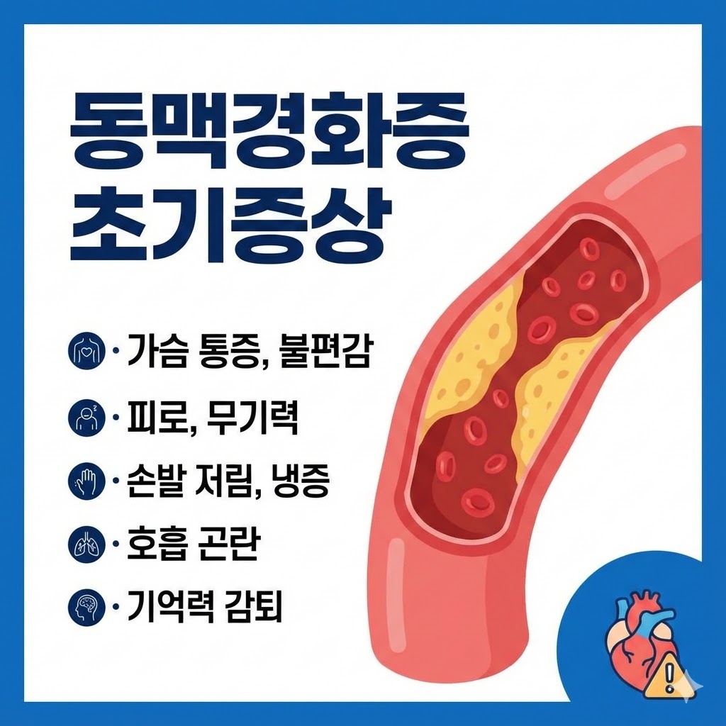동맥경화는 혈관 안에 플라크(지방·칼슘 등)가 쌓여 혈관이 좁아지고 탄력을 잃는 질환입니다. 이 과정에서 나타나는 미세한 변화들이 바로 우리가 주의해야 할 동맥경화증 초기증상입니다. 문제는 증상이 단순 피로와 혼동될 만큼 미약하다는 점입니다.