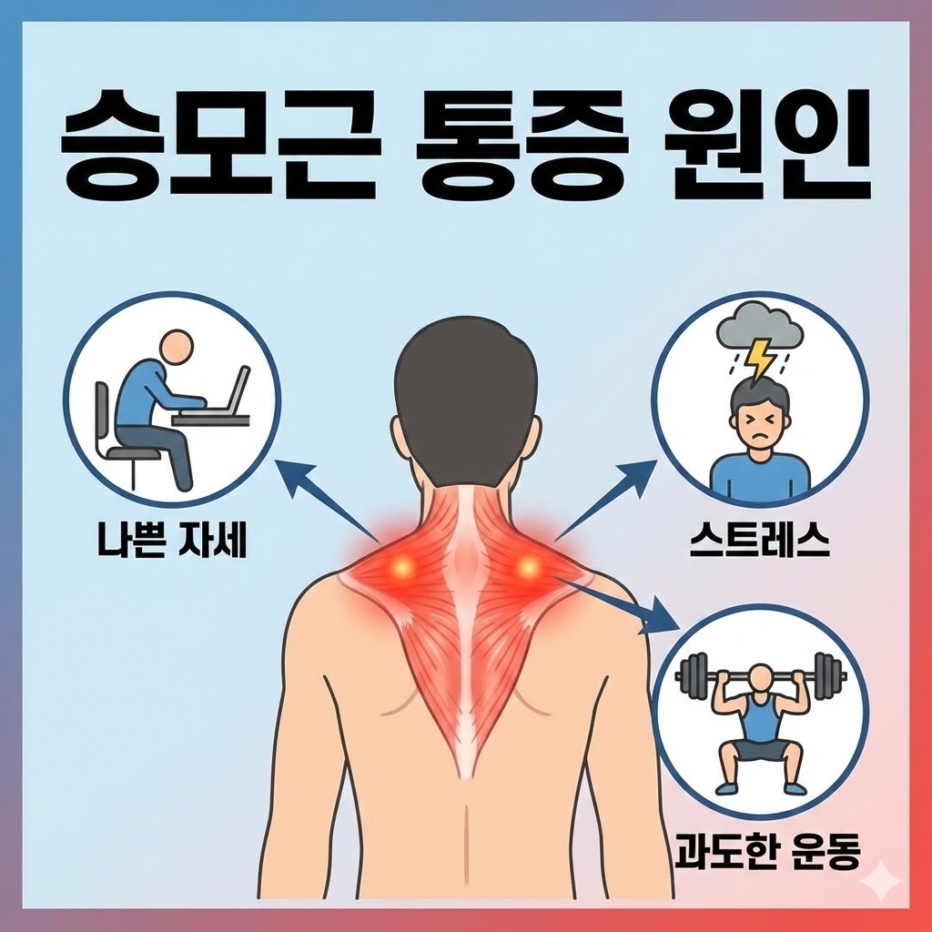 근육 속에 단단한 통증 유발점이 생기는 근막동통 증후군은 만성적인 승모근 통증 원인으로 자주 언급됩니다. 특정 부위를 눌렀을 때 심한 통증이 느껴지고 주변 부위까지 연관통이 퍼진다면 이를 의심해 봐야 합니다. 단순 피로를 넘어 근육 조직 자체가 변성된 상태이므로, 전문적인 치료가 필요한 승모근 통증 원인이라 할 수 있습니다.