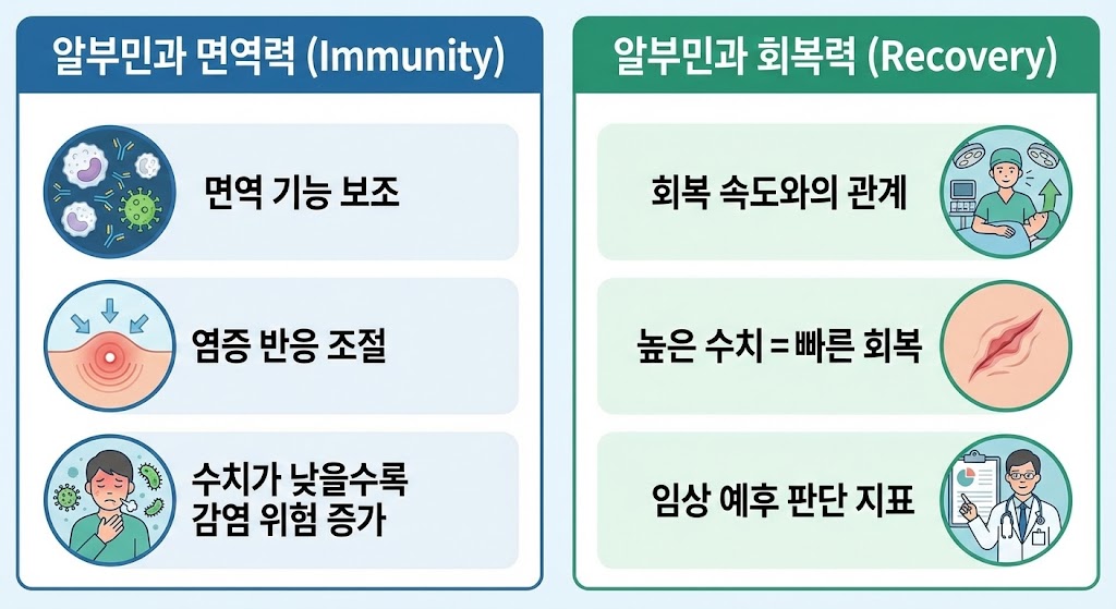 - 수술·질병 후 알부민 수치가 높을수록 회복이 빠릅니다.
