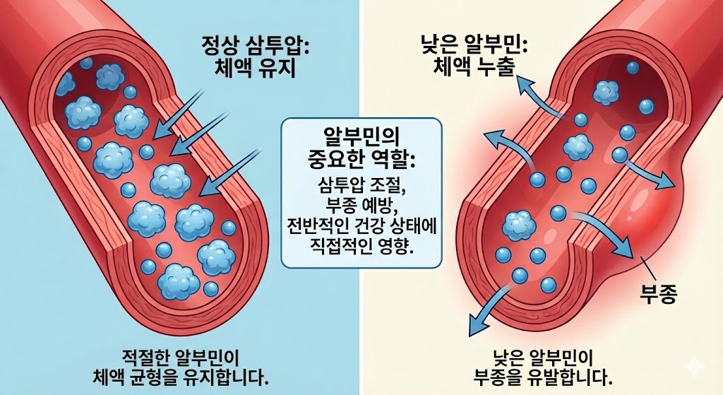알부민의 가장 대표적인 기능은 혈관 내 삼투압을 유지해 체액이 혈관 밖으로 빠져나가지 않도록 막는 것입니다. 알부민 수치가 낮으면 부종이 쉽게 발생하는 이유가 여기에 있습니다. 이런 점에서 알부민의 효능은 단순한 영양 문제를 넘어 전신 컨디션과 직결됩니다.