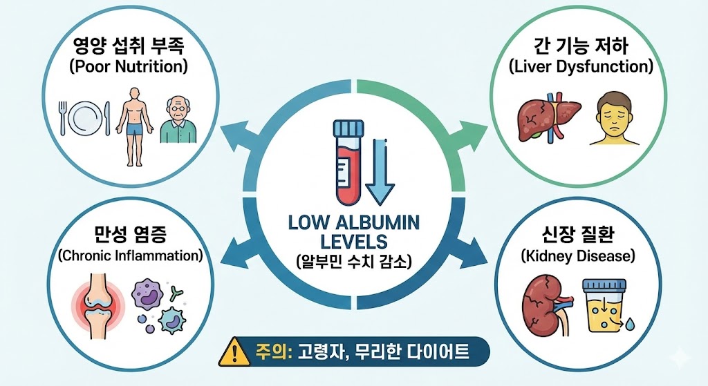 영양 섭취 부족, 간 기능 저하, 만성 염증, 신장 질환 등이 알부민 감소의 주요 원인입니다. 특히 고령자나 다이어트를 무리하게 진행하는 경우 알부민의 효능을 충분히 누리지 못하는 상태가 될 수 있어 주의가 필요합니다.