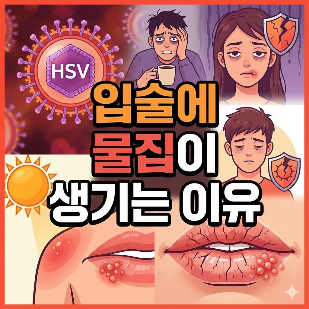 가장 흔한 입술에 물집이 생기는 이유는 단순포진 바이러스(HSV-1) 감염입니다. 이 바이러스는 평소 신경절에 잠복해 있다가 신체 기능이 저하되면 활성화되어 수포를 형성합니다. 한 번 감염되면 완치가 어렵고 반복적으로 나타나기 때문에, 본인만의 발생 패턴을 파악하는 것이 중요합니다.