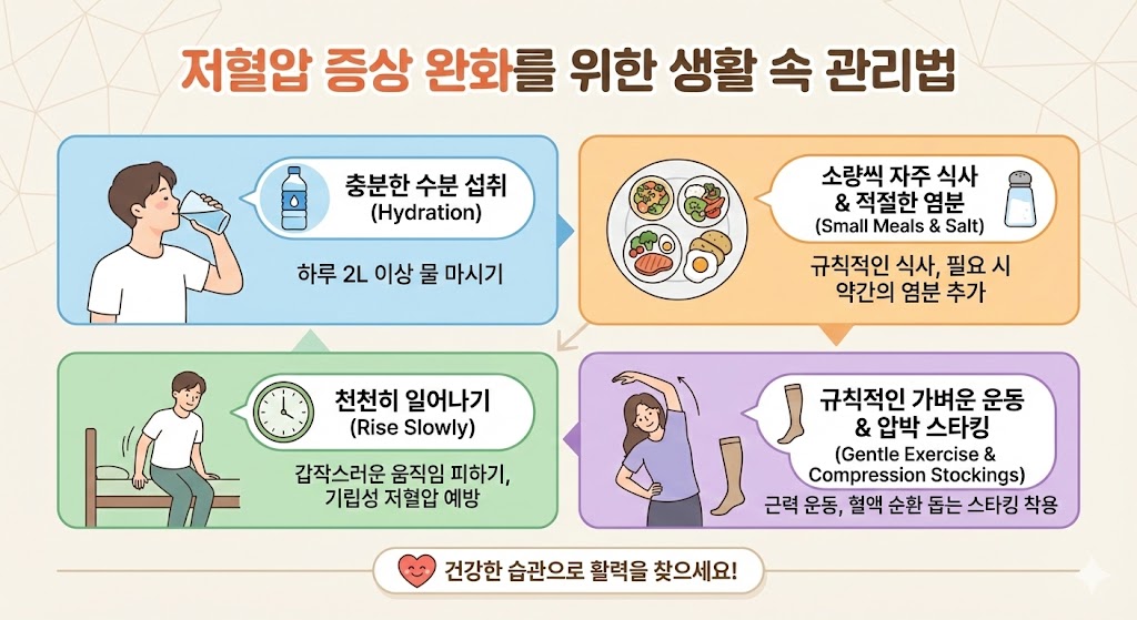 - 천천히 자세 바꾸기: 특히 아침에 일어날 때나 오래 앉아 있다가 일어설 때, 급격한 자세 변화를 피하고 천천히 움직여 기립성 저혈압을 예방합니다.