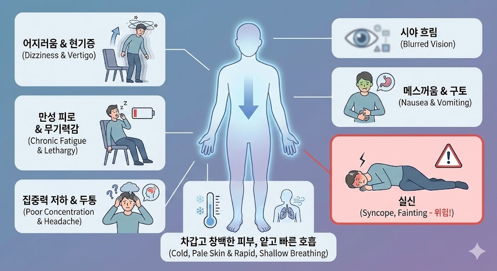 저혈압 증상은 매우 다양하게 나타나며, 개인에 따라 느끼는 정도의 차이가 큽니다. 가장 대표적인 증상부터 일상에서 놓치기 쉬운 신호까지 꼼꼼히 살펴보겠습니다.